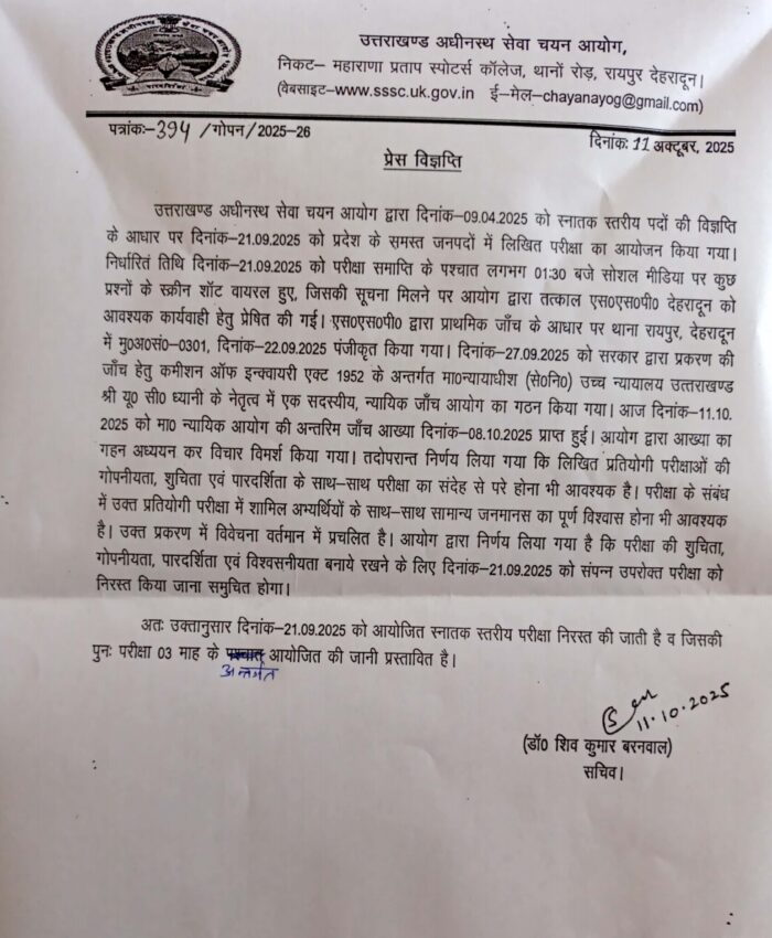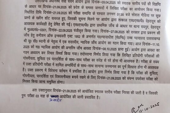 देहरादून। उत्तराखंड अधीनस्थ सेवा चयन आयोग ने 21 सितंबर, 2025 को आयोजित प्रतियोगी परीक्षा को