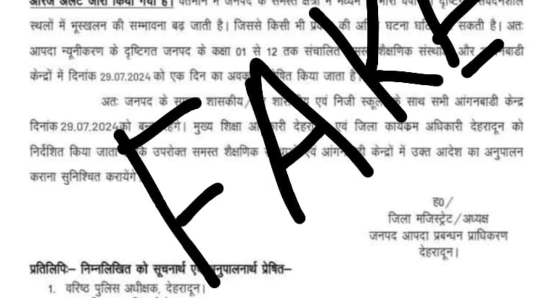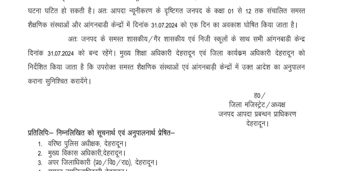 देहरादून, 29 जुलाई 2024: देहरादून जिले में भारी बारिश की संभावना को देखते हुए जिलाधिकारी ने कल सभी स्कूलों में छुट्टी की घोषणा कर दी है। जिले में लगातार बारिश हो रही है और मौसम विभाग ने अगले 24 घंटों में और अधिक भारी बारिश की चेतावनी जारी की है। इसे ध्यान में रखते हुए, […]