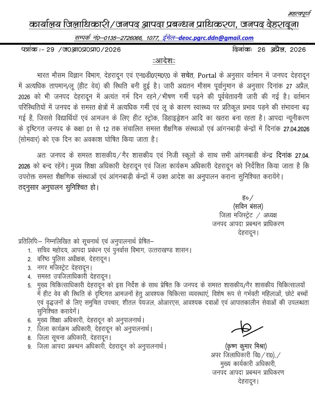 देहरादून। भीषण गर्मी और बढ़ते तापमान को देखते हुए प्रशासन ने बड़ा फैसला लिया है। कल के लिए कक्षा 1 से लेकर 12वीं तक के सभी स्कूलों में छुट्टी घोषित कर दी गई है।